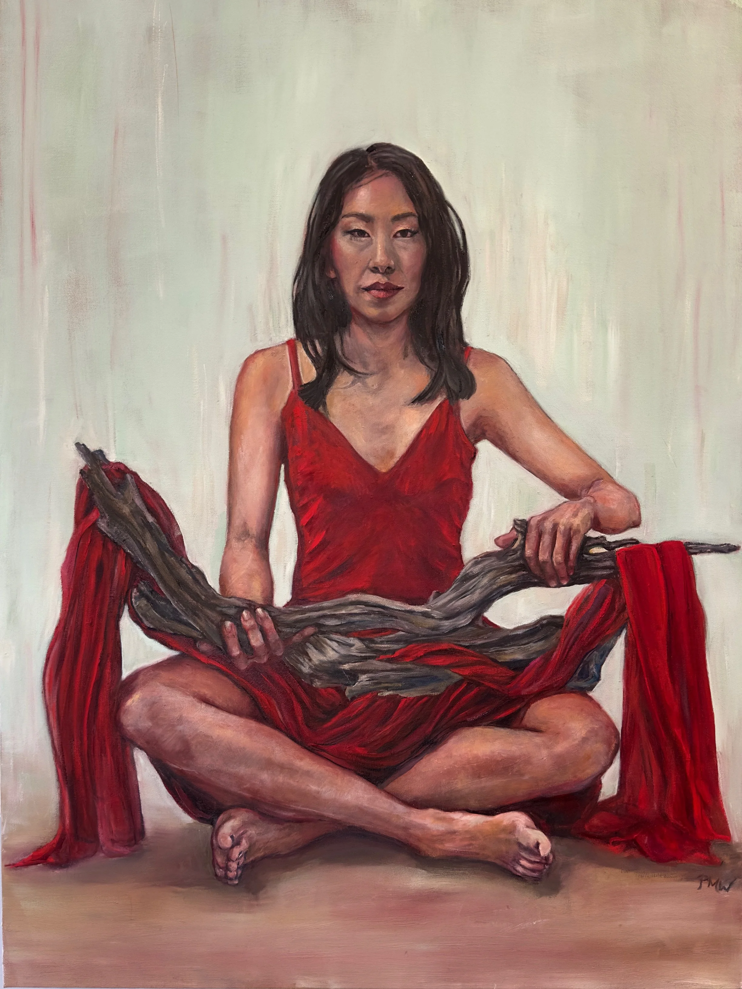 The woman in the red dress sits like a guardian of the shoreline, holding a piece of driftwood that seems to hold stories of its own. There’s a harmony between the ember tones of her dress and the natural textures of wood and sand, echoing the resilience of the barrier islands. Her face is a blend of calm strength and introspection, inviting the viewer to reflect on both the natural world and the stories it holds.